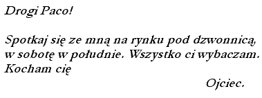 Oczekując przebaczeniaPewna hiszpańska opowieść mówi o ojcu i synu, którzy oddalili się od siebie po latach zaciętych konfliktów. Syn w końcu uciekł z domu. Widząc, że go nie ma, ojciec ze złamanym sercem wyruszył na poszukiwanie. Szukał całymi miesiącami - na próżno. Wreszcie, w ostatecznym akcie desperacji, zamieścił w lokalnej gazecie ogłoszenie:![]() Anonim